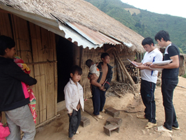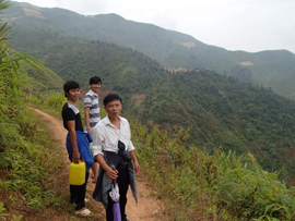 村は車の道から山を一つ、二つ越えて、沢の横や、山の中腹や、斜面に僕らの目を避けるかのようにひっそりとある。途中には山肌や斜面を利用した見事な耕作地があって、米やトウモロコシが山の水や焼畑を利用して栽培されている。村は4−500人程度、10−20戸ほどの集落で、タイ、モン、ラフー、ハニー、マン、などの少数民族ごとに住み分けられている。 驚くのはどんな奥の村に行っても国の小学校が建てられて、数人の教師が配属されていることである。先生たちはいわゆるベトナム人のキン族ではなく、教育レベルの高いタイ族の人たちだったりするが、やはり民族が違うと言葉が通じない。つまり子供たちとあまりコミュニケーションが出来ない。さらに、村の子供たちの半分以上は日中家族と山の畑に働きに出てしまうので学校に来ないという。