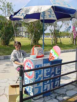 秋田名物として名をはせるババヘラアイスのルーツは沖縄、というのはほぼ間違いないようだ。今回の旅でも国道58号線を2時間ぐらい走っただけで五人の「アイスクリン売りの少女」に出会った。そのほとんどが10代のかわいい女の子たちである。アメリカではハイウエイわきにワゴン車をとめて売るアイスクリーム屋が今も健在で、それが原型のようだ。戦後すぐにアメリカ軍がはいってきた沖縄では路上にワゴンを止め、そこでアイスを売るアメリカ式の商売が早くからあったという。その日本的バージョンが道路横でパラソルを張りアイスクリンを売る少女たちなのである。写真の少女は平良さん16歳で、朝の9時から夜6時まで働いて日給4600円、アイスは150円で秋田のざらざらした味覚よりもなめらかミルキーで、うまい。アイス缶には「ビッグアイス」と商品名(会社名)が書かれていたが、どうもこのメーカーが一番の大手らしく、いたるところで目に付いた。少女たちのアイスがなぜ秋田で「婆」にばけ定着したのか、そのへんはこれからの課題だが、平良さんに「秋田ではババアが売ってるんですよ」と教えたら大笑いしていた。沖縄ではアイスはかわいい少女たちが売って何ぼのもの、なのである。