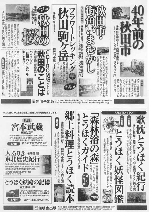 新しい「新刊案内」が出来ました。それにあわせて読者DMを出しました。年三,四回、読者DMを出すのが理想なのですが、いつも新刊が特定時期に集中してしまい、最近は年二回がようやくです。買ってくださる方々にとれば、一度に新刊がドドンと出てくるので、買いたくても一度には買えない、という苦情もあるようです。申し訳ありません。どうしてもバランスよく刊行計画が立てられません。私どもばかりでなく印刷所にも責任のいったんはあるのですが、責任転嫁している場合ではありませんね。これも無明舎の個性、と居直っていくしかないようです。DMの届かない人にもインターネットでパンフや新刊案内が見られるように画像も添付しました。ご覧下さい。ホームページの「近刊・新刊」コーナーも合わせてごらんいただければ幸いです。
