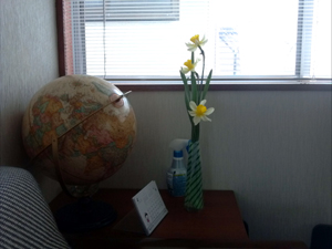 敷地の端のほうに目をやると、背の高い草に覆われて気づかなかったが、綺麗なスイセンが咲いていた。これは買う手間が省けた。スイセンを摘んで仕事場に飾ってみた。