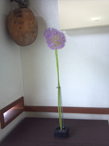昼食の帰り、会社の近くにある花屋の前をとおりかかると、たくさん花が並んでいた。五月は一年で一番花の種類が多い月なのだそうだ。中でもひときわ異彩を放っていた花を購入した。ボンボリのような形をしていて、その姿形は華やかな花たちのなかでもはっきりと目立った。仕事場に戻ってからネットで花名を調べると、ゆり科の植物で、アリウム・ギガンチウム。和名はハナネギ(花葱)。見た目からは想像もつかないが、葉をちぎってみると確かにネギの匂いがする。花のインパクトが強いから、シンプルな一輪挿しに入れ、玄関の靴箱の上に飾ってみた。