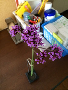 花屋に行く途中、道端に背の高い紫色のきれいな花を見つけた。花序がなんとも愛くるしく、これを飾ろうと、会社に引き返し、裁ち鋏を持っていき、適当な長さに切って持ち帰った。学名はバーベナ・ボナリエンシス。南アメリカ原産(ブラジル〜アルゼンチン)で、日本には園芸植物として導入されたが、野生化して空き地や道端などに生えている。和名のヤナギハナガサは花序を「花笠」にたとえ、細い葉を「柳」にたとえたものだそうだ。