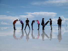 「プロフェッショナルY」。寡黙だった日系ブラジル人が口を開いた。彼はウユニ塩湖3回目のリピーター。「Y」とは「UYUNI」の2文字目の「Y」のこと。雨期のウユニ塩湖では人影が綺麗に反射する「天空の鏡」を生かして、様々なポーズの写真を撮影するのがお決まりとなっている。人気のポーズの1つがツアー参加者9人で「UYUNI」の人文字の影を湖面に映し出すというもの。その撮影の前にすかさず申し出たブラジル人の彼。ウユニ塩湖3回目にして、「Y」のポジションを極めたようだ。 ウユニの町に到着したのは2月5日の早朝6時頃。夜行バスに揺られてボリビアの首都のラパスからやってきた(憲法上の首都はスクレ)。前日の4日はラパスを散策。世界最高地点にある首都だけに、ぶらりと町歩きをするだけでも息切れを起こす。 ラパスでは「ミ・テレフェリコ」という2014年に完成したばかりのロープウェーに乗ってみた。このロープウェーは観光用ではない。通勤や通学などの日常生活用。交通渋滞を緩和するために造られた。よって、わずか3ボリビアーノ(約51円、1ボリビアーノ=17円で計算)の料金で、ラパスのすり鉢状の街並みを空から遊覧することができる。 ウユニ塩湖へはH社のツアーを利用。日本人の参加者が多い。申し込んだのは昼間のウユニ塩湖を楽しむ「デイツアー」と夕日のウユニ塩湖を堪能する「サンセットツアー」。ウユニ塩湖を楽しめるかどうかは天候次第。他の参加者の中には、最高のタイミングを待つため、5日間ウユニに滞在するという日本人もいた。しかし、私たちに与えられた時間は1日だけ。朝から続く快晴がもってくれることを願う。午前10時30分頃、4WDの車に乗って、ウユニの町を出発した。 ウユニ塩湖に到着したとき、天気は良好のまま。鏡張りの美しい塩湖の上で、ガイドが用意してくれた昼食のフラミンゴの肉を食べる。そのあとは、ツアー参加者総出で写真撮影。「UYUNI」の人文字の他に、組体操の扇形のポーズやアニメ「ONE PIECE」の名場面のポーズなどで写真を撮った。 今度は水の張っていない場所へ移動。「トリック写真」を撮影する。ガイドがゴジラの人形やポテトチップスの空き容器の筒を取り出し、真っ白な塩湖の背景と遠近法を使って写真を撮影してくれる。目の錯覚で、巨大なゴジラと戦っているような写真やポテトチップスの筒の上を歩いているような写真が撮れた。 午後16時半頃、塩のホテル「プラヤ・ブランカ」で休憩していると、暗雲が空を覆いはじめた。横殴りの強い風も吹きはじめる。不安を感じながら、ガイドの方を見ると、のんきに缶ビールを飲んでいる。「サンセットは大丈夫か」と聞くと、ガイドは浮かない表情。サンセットは駄目かも知れない。 駄目もとでサンセットが綺麗に映りそうなポイントを探す。ウユニ塩湖を車であっちに行ったりこっちに行ったり。しかし、雲に覆われた塩湖で、サンセットの絶景は断念するしかないとガイドが言う。諦めようとしたとき、別の車の年配のガイドが「少しだけ良さそうな場所がある」と伝えにきた。その言葉を信じて車を走らせる。しかし、結果はさらに悪くなってしまった。 完全に諦め切ったツアー参加者を尻目に、再びガイドは車を走らせはじめた。到着したのは先ほどとあまり代わり映えのない地点。しかし、到着して数分後、地平線にのびる雲の隙間から赤い夕日がさしはじめたのだ。昼間とはひと味違ったウユニ塩湖の景色にしばらく見とれていた。経験に裏づけられたガイドの勘に感謝である。 明日は旅のふりだしのアルゼンチンに戻る。いよいよ旅も終わりに近づいてきたと実感する。塩湖の強い日差しで火照った体をウユニのホステルで休ませた。 |